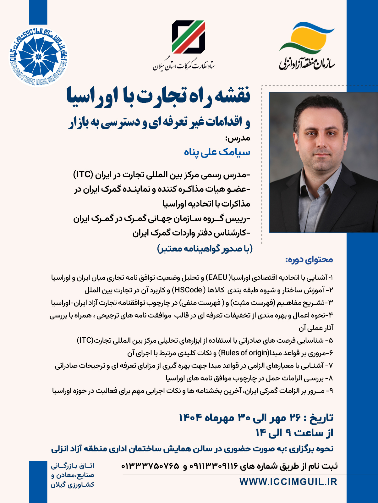 به اطلاع میرساند اتاق بازرگانی گیلان درنظر دارد با همکاری حوزه نظارت گمرکات استان گیلان و سازمان منطقه آزاد انزلی، دوره آموزشی "نقشه راه تجارت با اوراسیا و اقدامات غیرتعرفهای و دسترسی به بازار" را در تاریخ 26 الی 30 مهرماه ساعت 9 الی 14 در سالن همایش ساختمان اداری منطقه آزاد انزلی برگزار نماید.