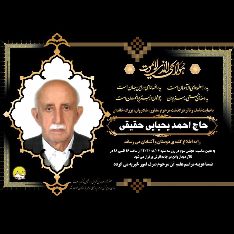 با نهایت تأسف و تأثر، درگذشت پدر بزرگوارتان، مرحوم حاج احمد یحیایی حقیقی را به جنابعالی و خانواده محترم تسلیت و تعزیت عرض مینماییم.