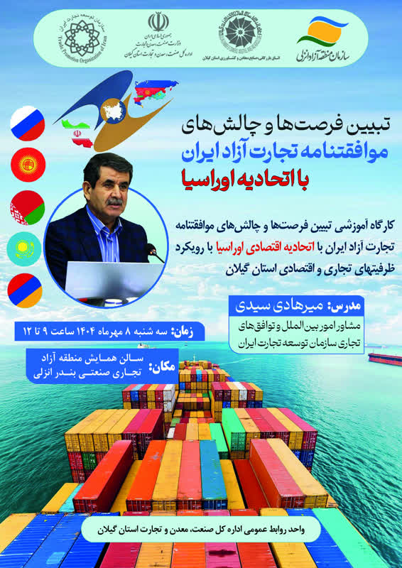 به اطلاع فعالان اقتصادی و بازرگانان محترم میرساند، کارگاه آموزشی تبیین فرصتها و چالشهای موافقتنامه تجارت آزاد ایران با اتحادیه اوراسیا روز سهشنبه 8 مهرماه 1404 ساعت 9 تا 12 در سالن همایش منطقه آزاد تجاری - صنعتی بندر انزلی برگزار میشود:
